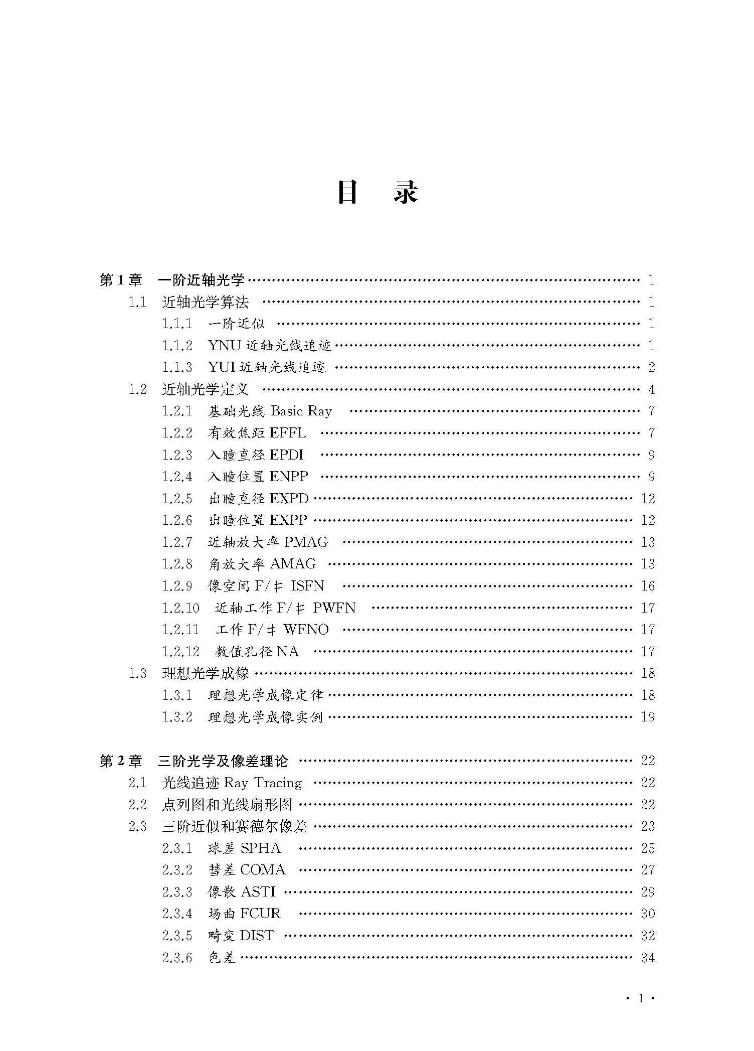第一、二章,主要以一阶近轴光学和三阶像差理论为主的光学设计基础知识。一阶光学是应用光学的基础,重点讲解了近轴光学下定义的各种光学参数和概念,并且提供了在软件中的查看方式。三阶像差给出了对应的分析窗口和控制方法。