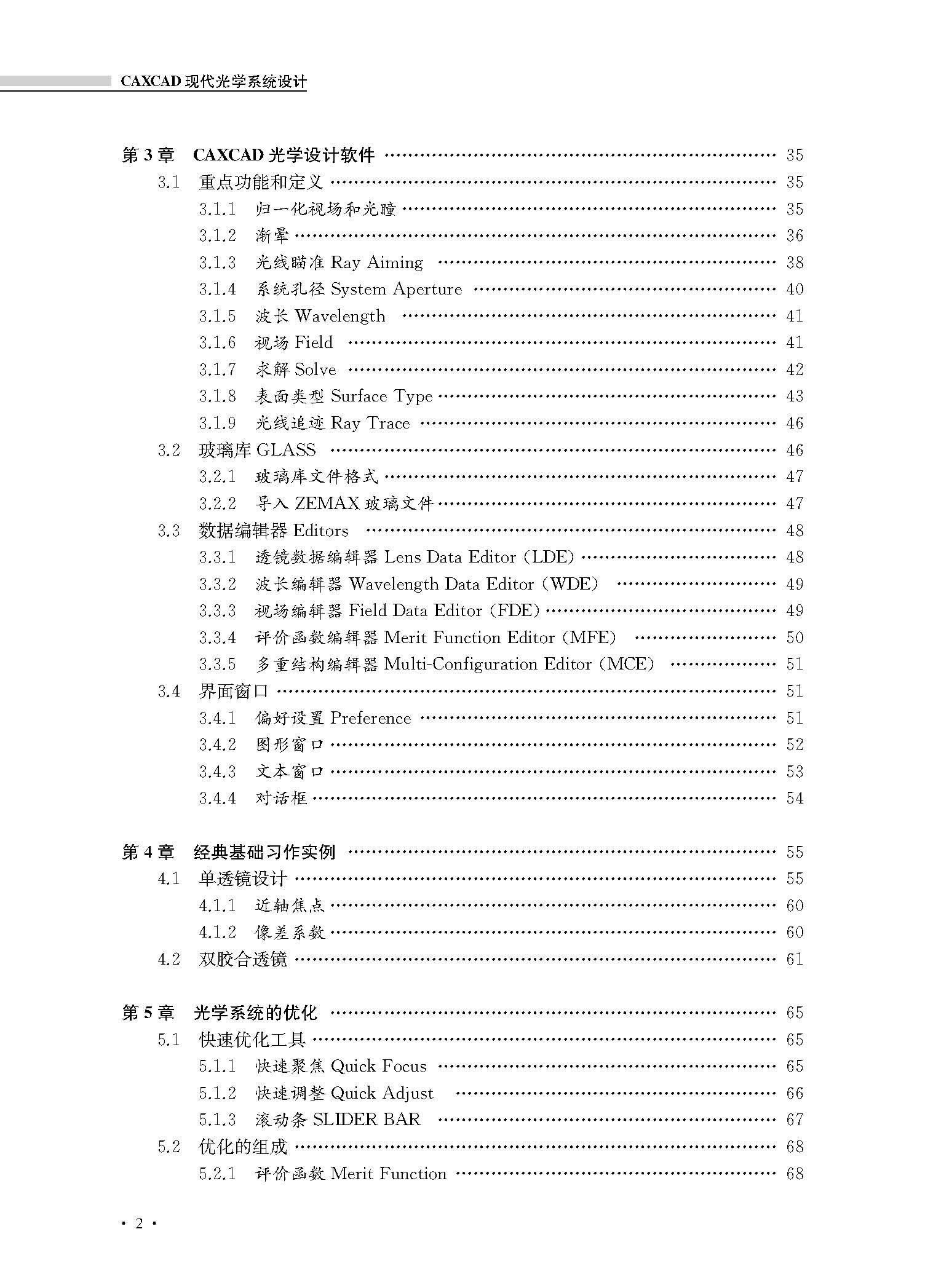 近年随着光学行业的迅猛发展,国内各种光学设计类书籍应运而生,为光学行业的发展和光学设计人才的培养提供了有力支持。《CAXCAD现代光学系统设计》这本书亦是时代召唤的产物。本书是国内第一本以自主开发的光学设计软件CAXCAD为工具的应用光学书籍。书籍的最大特色是作者根据多年的光学设计实战经验,专业培训技能以及前瞻的现代应用光学科研视野,从光学设计者学习的角度出发,选取经典光学设计实例结合理论说明,深入浅出、循序渐进,让读者能够直观、快速掌握对应知识和设计技能,无论读者借助何种CAD工具,均可获益。书中的全局优化快速引擎、Multi-Start快速初始结构、SSN2敏感度公差评价以及ASXY成像像散控制的案例,都是目前国外同类软件没有的特色功能。
