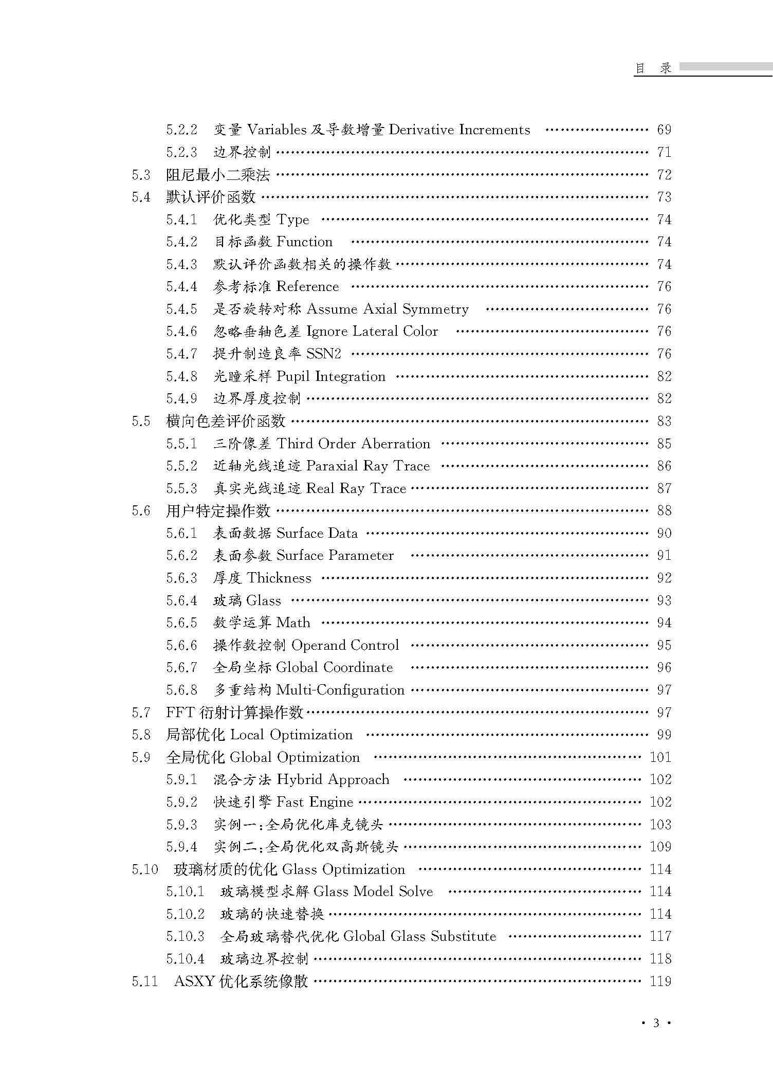 第五章 讲解了光学系统的优化,包括优化的工具,DLS算法,优化的组成要素,默认评价函数,详细的评价函数操作数,玻璃材料的优化,局部和全局优化的实例。