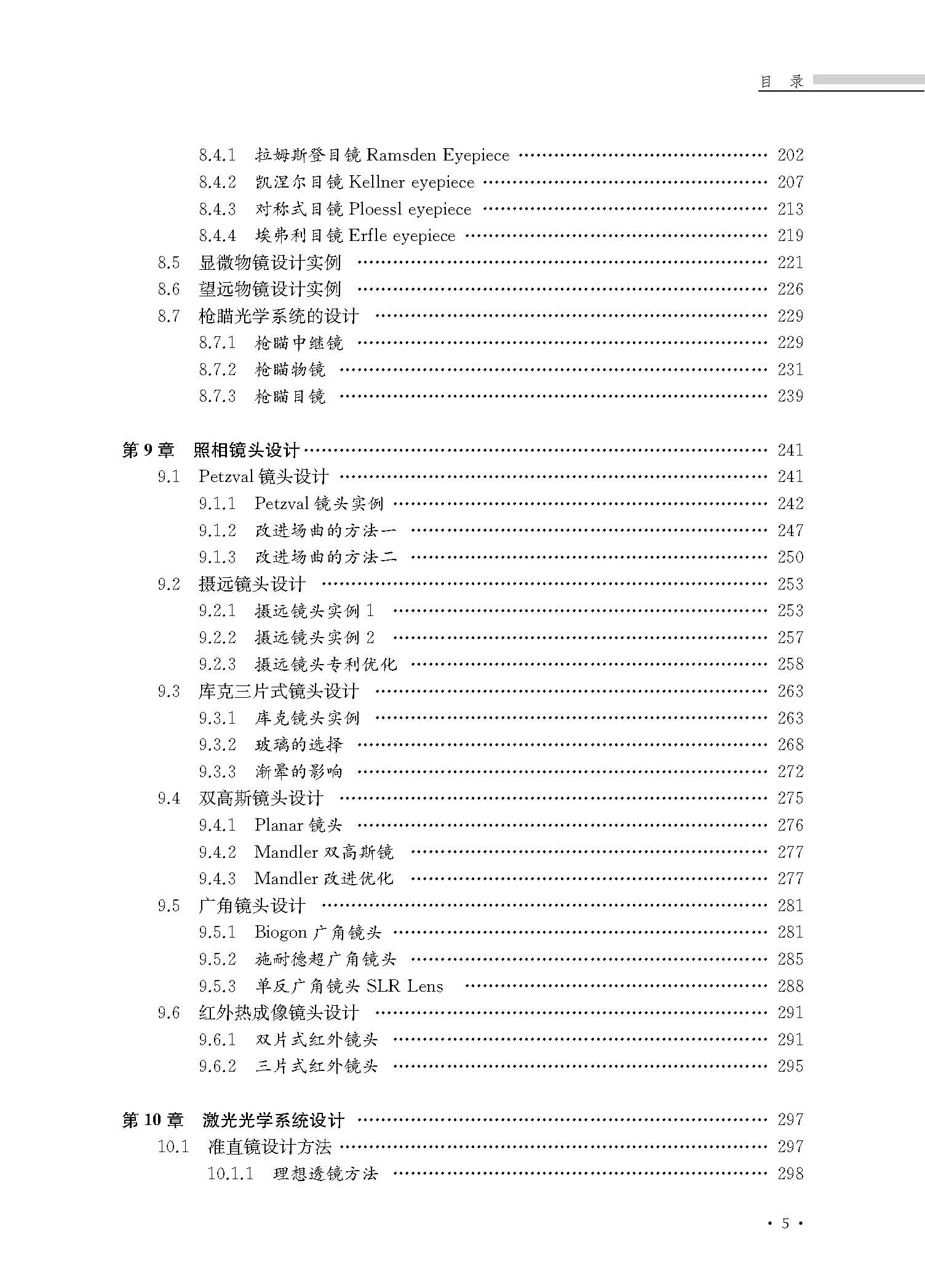 第九章 根据照相镜头设计的发展历史,从Petzval透镜开始逐步深入,针对摄远镜头、库克镜头、双高斯镜头、广角镜头和红外镜头的设计和特点,提供了经典的案例和改进设计方法。